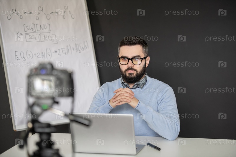 Серьезный бородатый мужчина держит руки за лицо, глядя на дисплей ноутбука