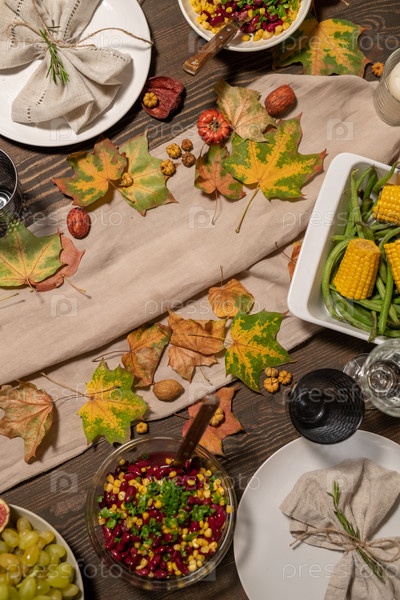Обзор подаваемого деревянного стола с вкусной домашней едой, приготовленной к ужину