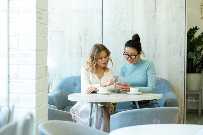 Две молодые спокойные женщины в повседневной одежде обсуждают онлайн-продукты на смартфоне