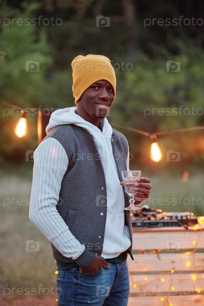 Счастливый молодой стильный мужчина африканской этнической принадлежности пьет перед камерой