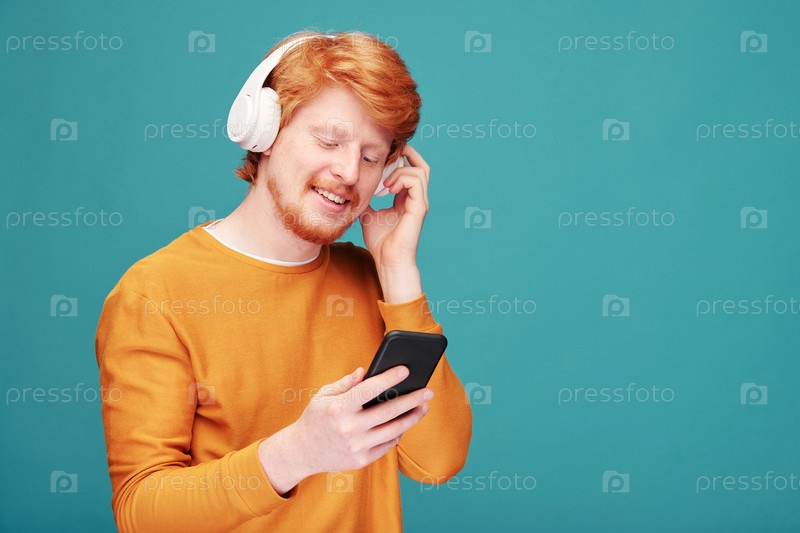 Счастливый молодой бородатый мужчина с зубчатой улыбкой, слушающий музыку в наушниках
