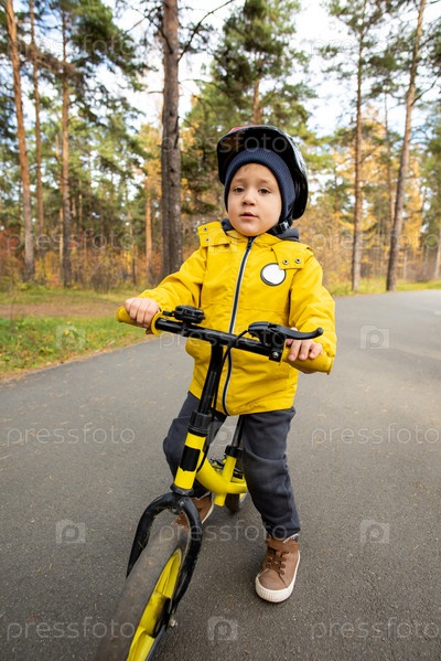 Очаровательный мальчик в повседневной одежде и шлеме безопасности стоит у своего велосипеда с балансом