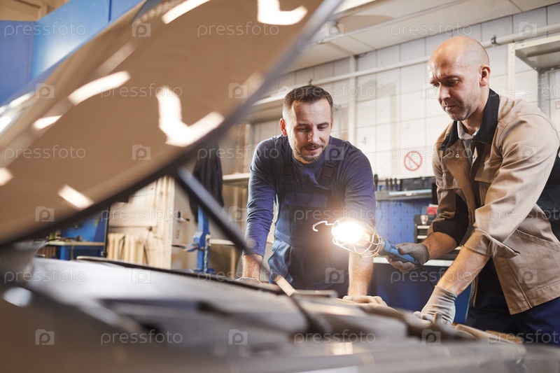 Механик, осматривающий автомобиль в автомагазине