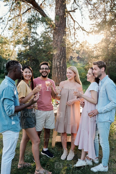 Молодые веселые мужчины и женщины разных этнических групп, поднимающие настроение напитками