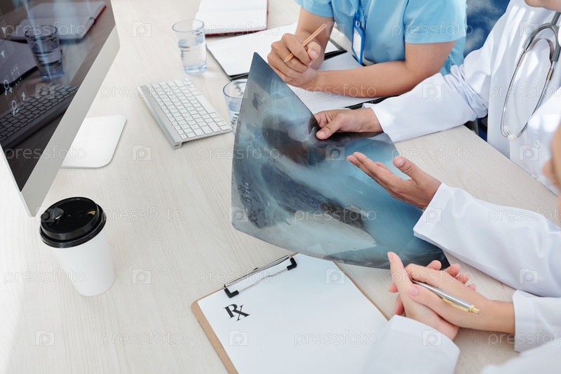 Врачи осматривают рентгеновское изображение легких