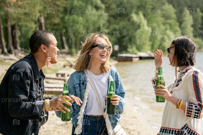 Взволнованные девушки, гуляющие по пляжу