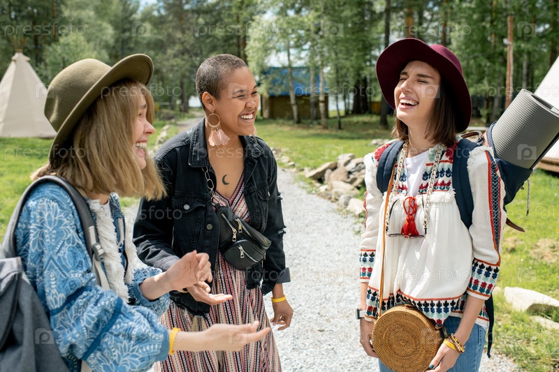 Девушки смеются вместе в лесном кемпинге