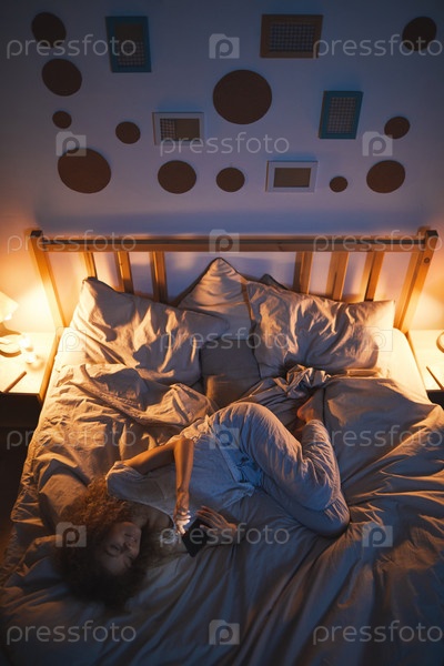 Девушка-подросток использует смартфон в постели по ночам