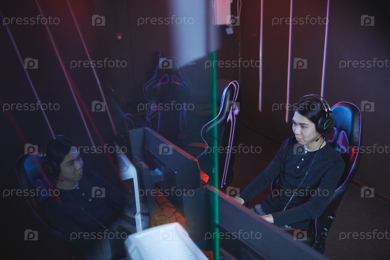 Высокий угол при азиатском мужчине, играющем в видеоигру