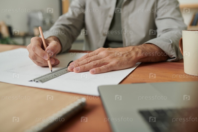 Близкий план неузнаваемого инженера, сидящего за столом и рисующего линию с помощью линейки во время работы над техническим планом