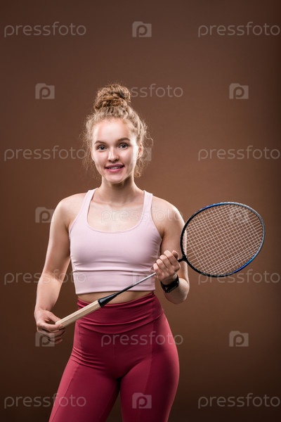 Молодая веселая блондинка, теннисистка в танковой шапке и носках с ракетой