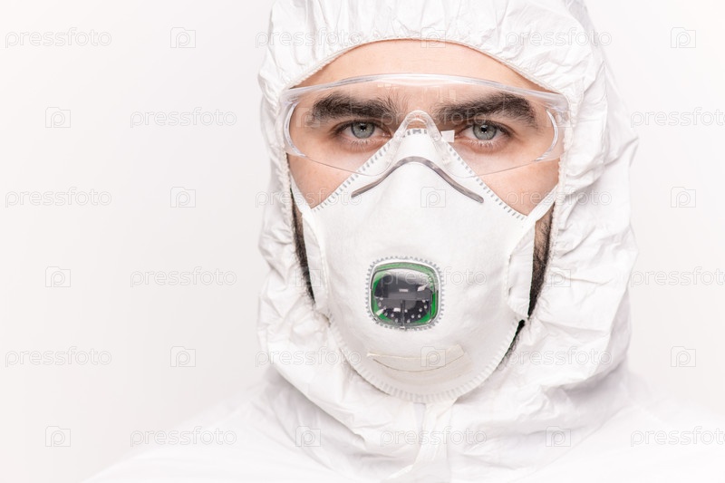 Молодой современный мужской ученый в защитных очках, масках и комбинезонах