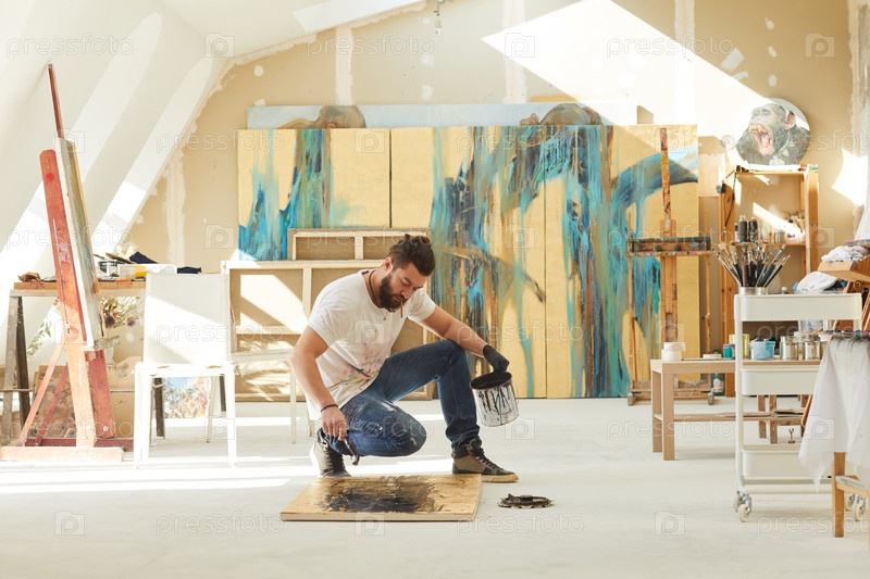 Бородатый художник рисует абстрактную картину в мастерской