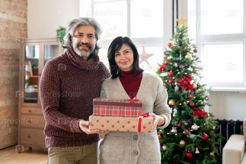 Любящая зрелая пара в повседневной одежде держит подарки для внуков