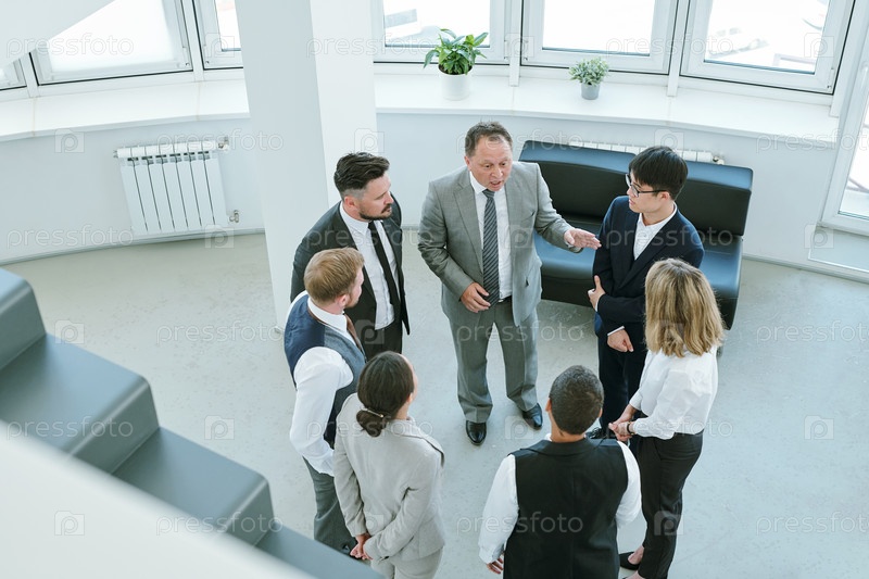 Несколько межкультурных деловых партнеров стоят внутри офиса на встрече
