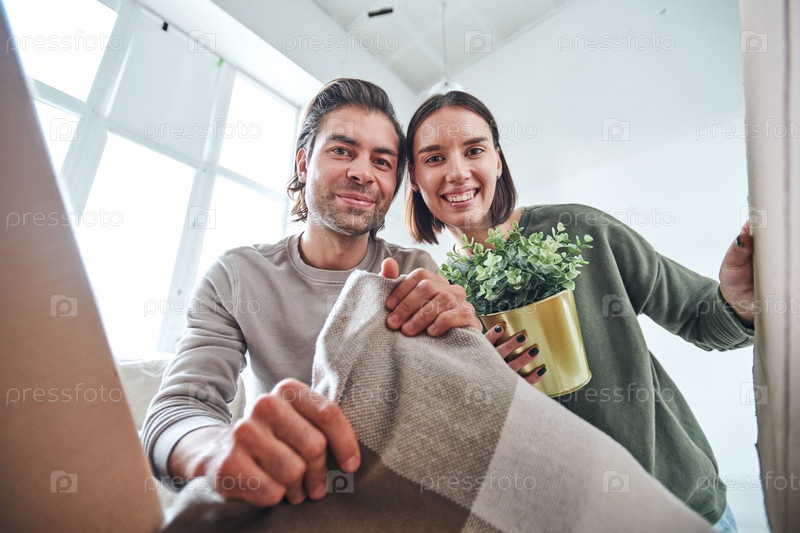 Веселая женщина с домашним растением и ее муж со слоновой коробкой для распаковки
