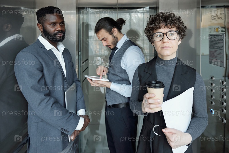 Молодая задумчивая бизнес-леди со стаканом кофе и бумагой, движущаяся в лифте