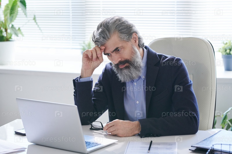 средний портрет серьезного зрелого бородатого мужчины, сидящего в офисе