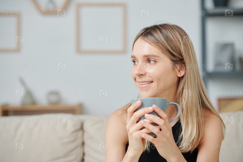 Современная молодая женщина с зубчатой улыбкой и длинными светлыми волосами, пьющая чай