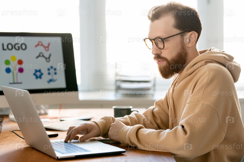 Молодой бородатый дизайнер смотрит на дисплей ноутбука, нажимая кнопку на клавиатуре
