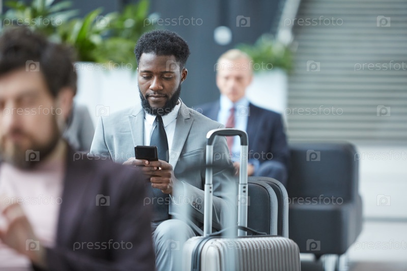 Бизнесмен со смартфоном в салоне отъезда