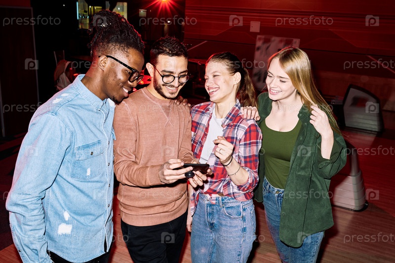 Молодой улыбающийся мужчина со смартфоном показывает друзьям фотографию своей девушки