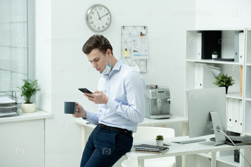 Молодой бизнесмен в защитной маске использует смартфон и пьёт чай