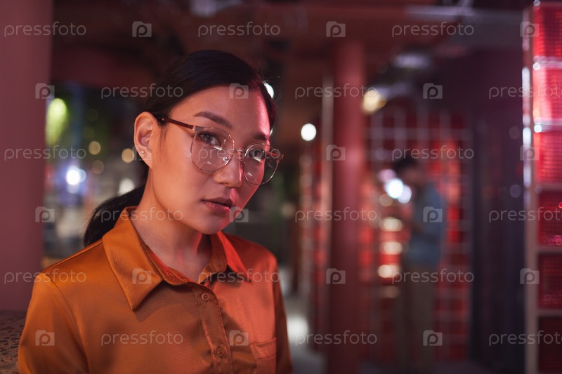 Женщина в футуристическом интерьере азиатская