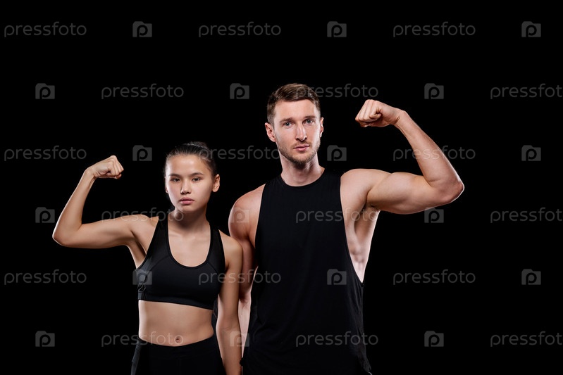 Молодой мускулистый спортсмен и сильная женщина в активной одежде показывают свою силу
