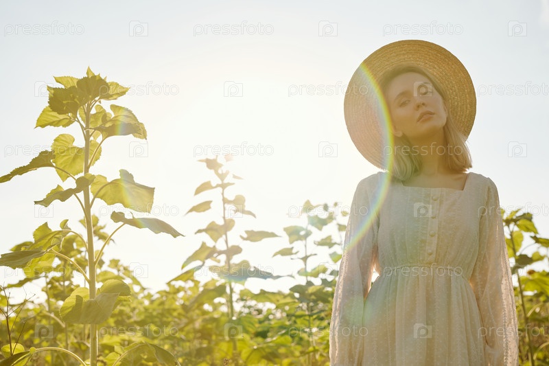Красивая молодая женщина в соломенной шляпе и белом деревенском платье смотрит на тебя
