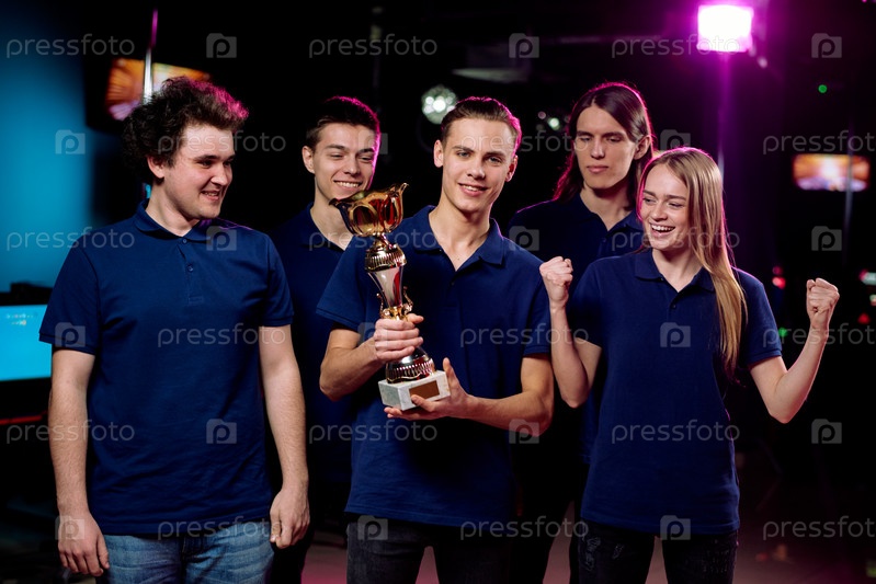 Молодой лидер киберспортивной команды, держащий золотой кубок среди своих друзей
