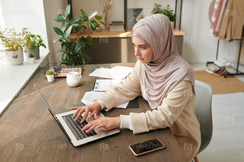 Ближневосточная деловая женщина, одетая в стильный хиджаб и абаю, работает на ноутбуке на современном рабочем месте, высокоугольная фотография