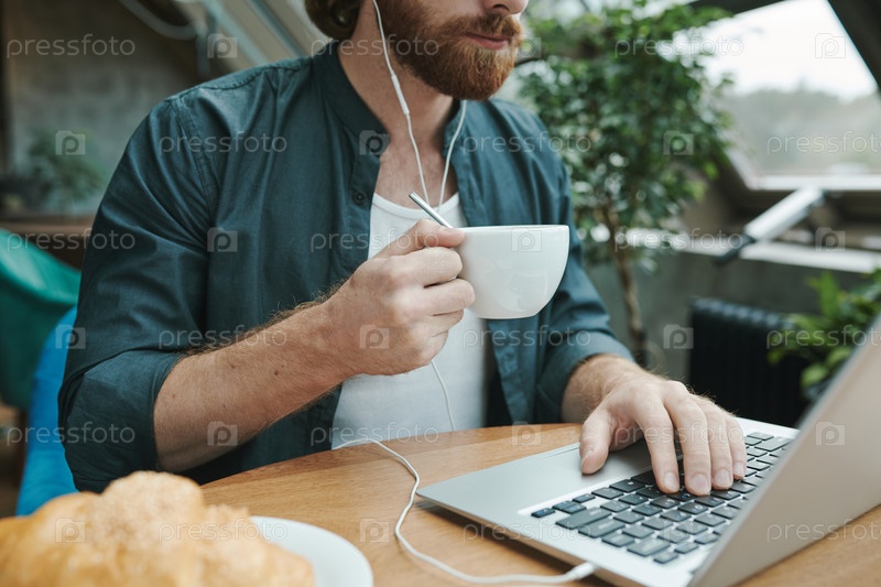 Молодой бородатый менеджер сидит за столом с чашечкой кофе и кроасаном и записывает голосовое сообщение для коллеги, используя смартфон в кафе