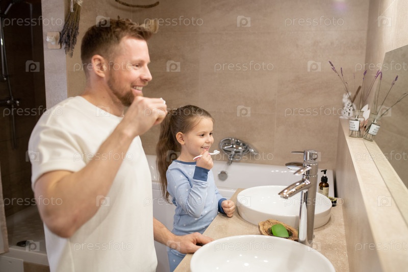 Счастливый молодой бородатый отец и его милая маленькая веселая дочь чистят зубы