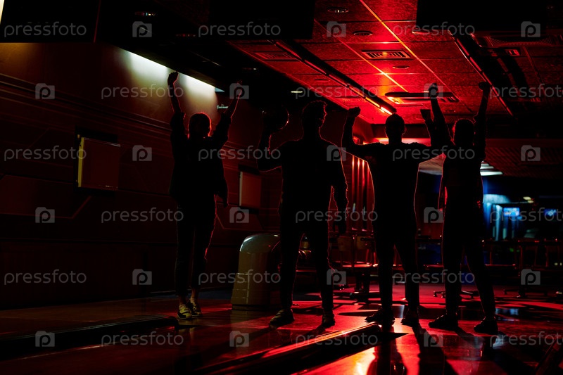 Группа молодых друзей с поднятыми руками, выражающих радость после игры