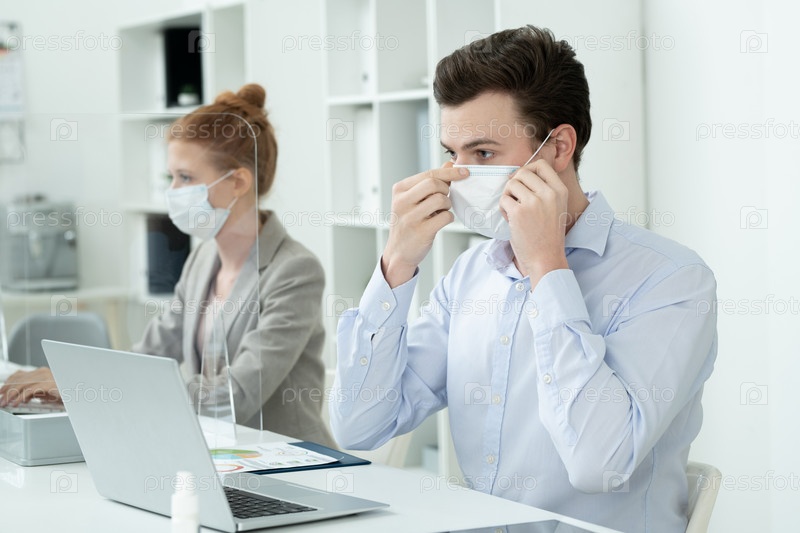 Бизнесмен надевает защитную маску на лицо, чтобы обезопасить себя от инфекции