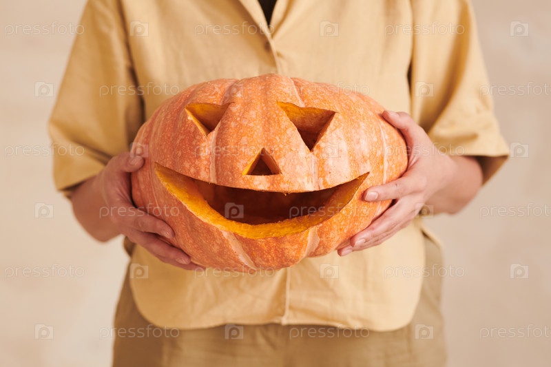Близкий план неузнаваемой женщины в желтом наряде, держащей смешную вырезанную тыкву во время подготовки к Хэллоуину