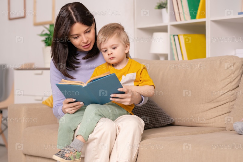 Красивая молодая мать читает своему маленькому сыну книгу сказок на диване