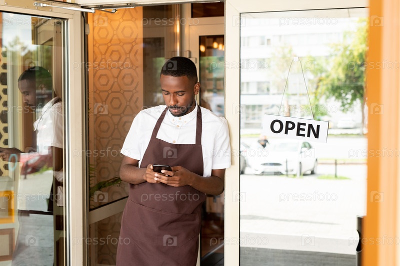 Молодой африканский официант со смартфоном прокручивает новые заказы клиентов