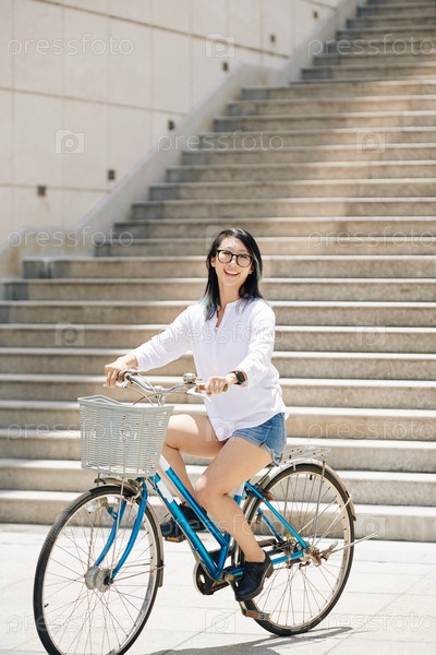 Улыбающаяся женщина едет на велосипеде