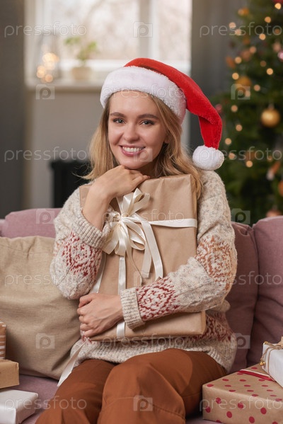Вертикальный средний портрет очаровательной молодой женщины, одетой в свитер и шляпу Санты, сидящей на диване с подарочной коробкой для Рождества, улыбающейся камере