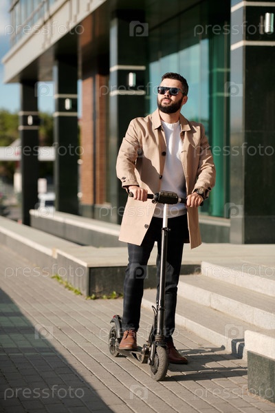 Элегантный бизнесмен в солнцезащитных очках, пальто и брюках движется на электрическом скутере
