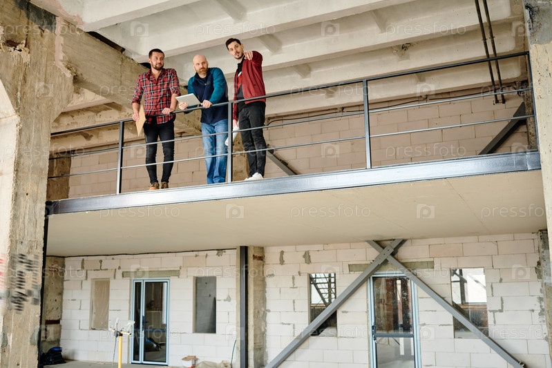 Один из трех молодых архитекторов, указывающих на угол незавершенного здания