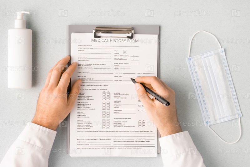 Руки клинициста с ручкой над медицинской формой, заполняющей личную информацию