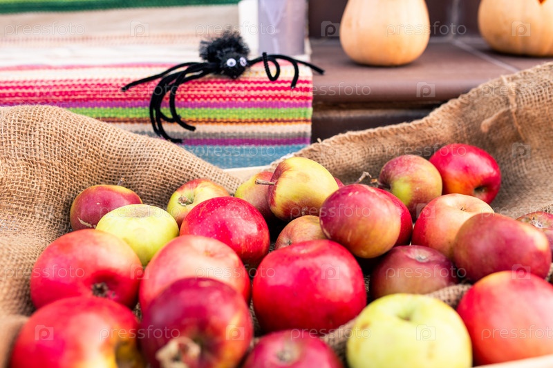 Куча спелых красных яблок на холстовом мешке на фоне большого черного игрушечного паука