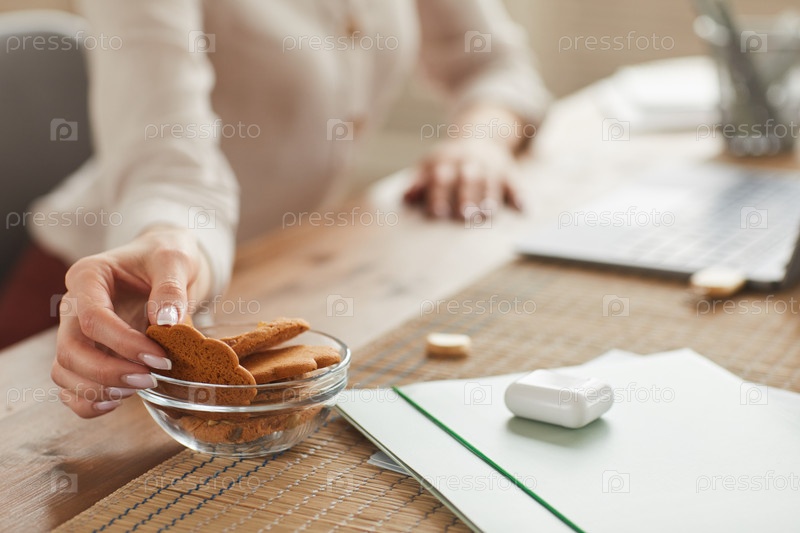 Женщина наслаждается домашними печеньями на работе