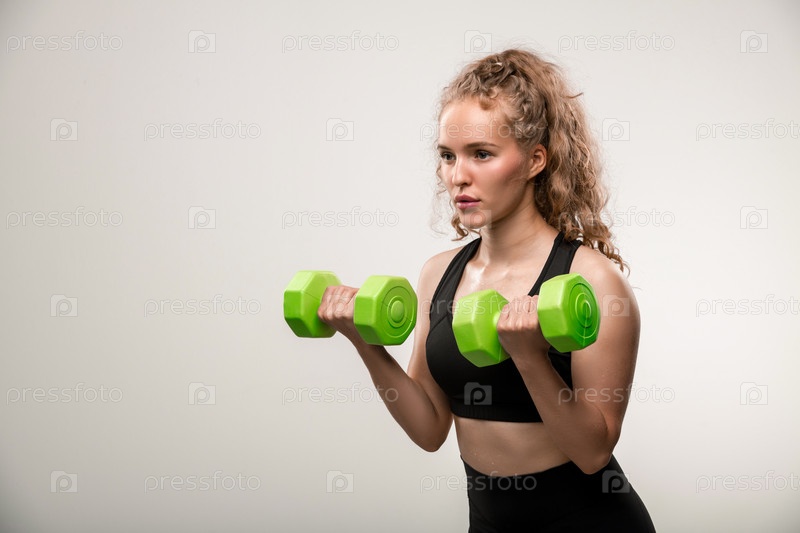 Блондинка в хорошей форме с кудрявыми волосами делает упражнения для мышц рук на гантели