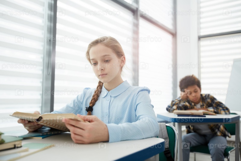 Блондинка читает книгу в школьном классе