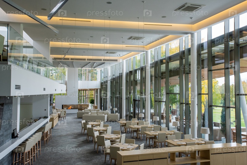 Интерьер современной роскоши с двумя рядами столов и белыми диванами для отдыха