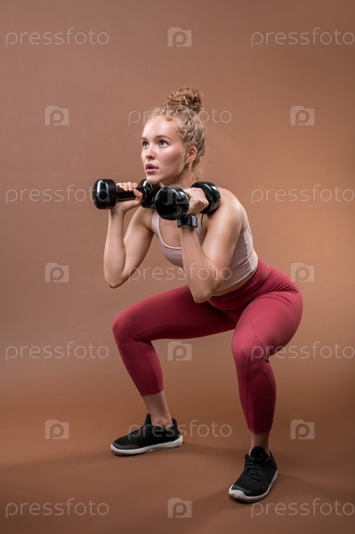 Молодая сильная спортсменка в спортивном костюме, сидящая на приседаниях и поднимающая гантели
